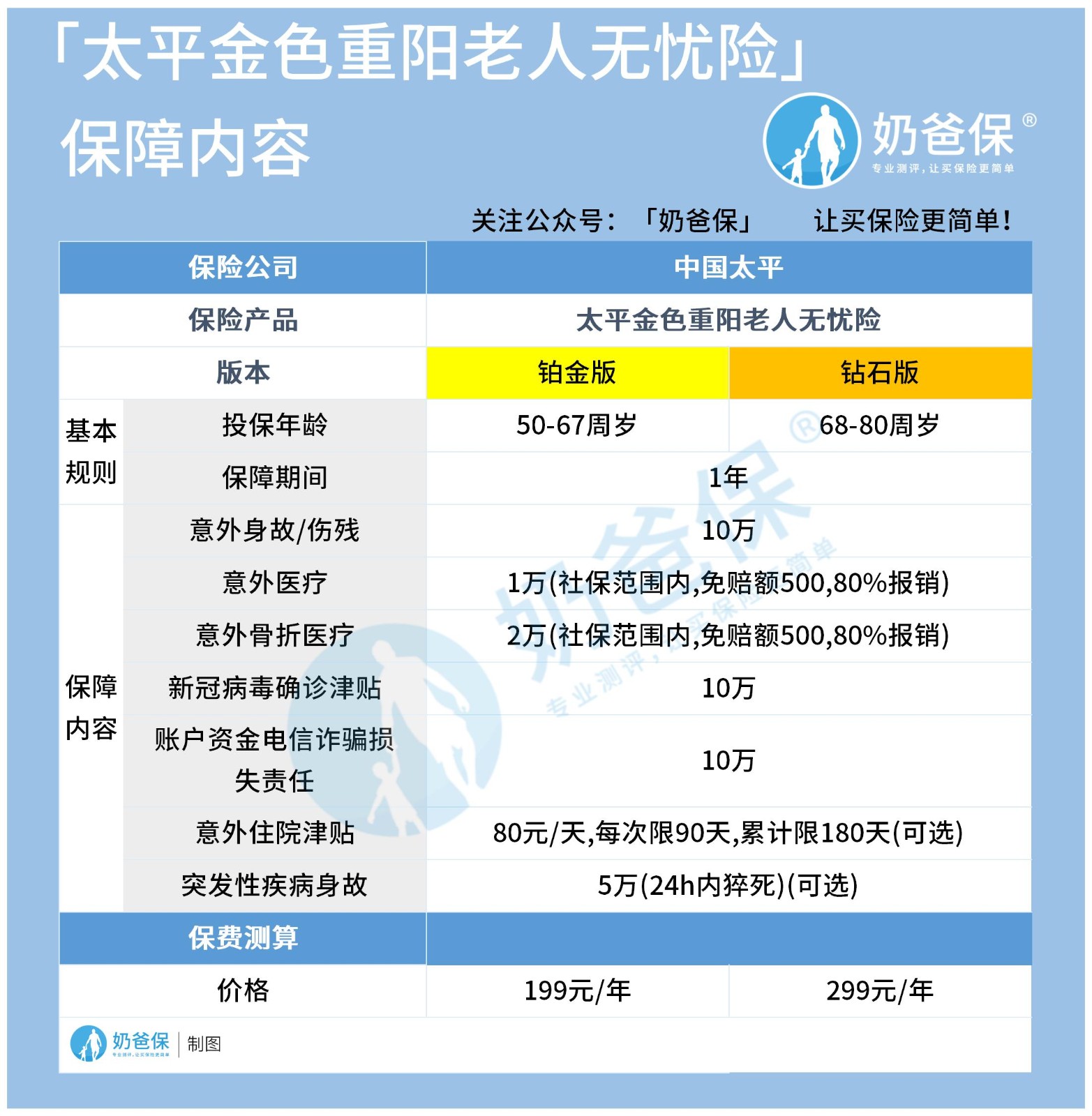 太平金色重阳老人无忧险是中国太平推出的一款老人意外险产品,它分为铂金和钻石两个版本,版本之间在保障责任上没有什么差异,只是对投保年龄有不同的限制。