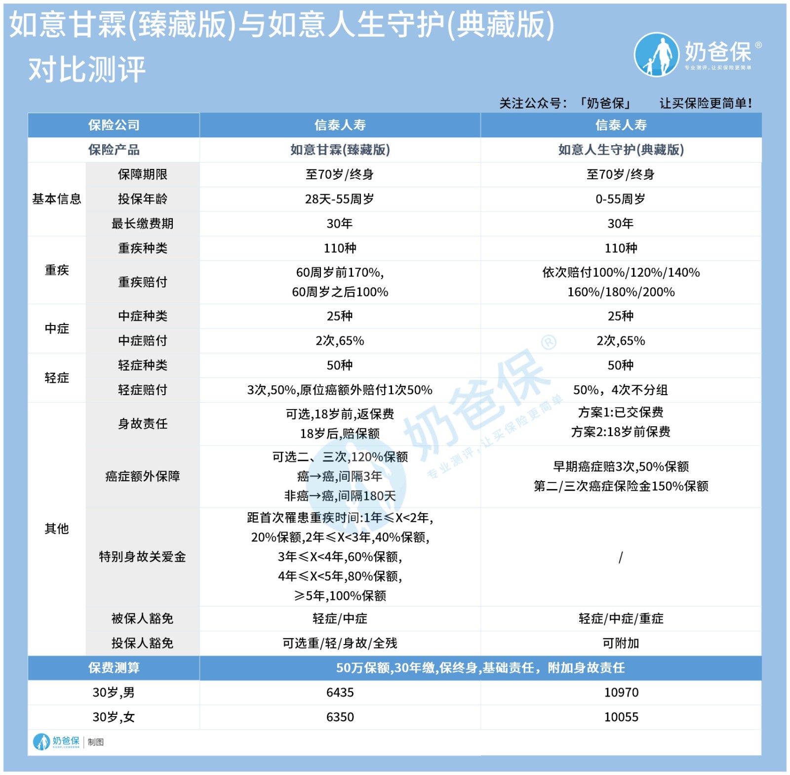 如意人生守护典藏版和如意甘霖臻藏版都是信泰人寿旗下的产品,前者是在重疾新规施行后首次推出的重疾险,而如意人生守护典藏版已经在市场上活跃了很长一段时间。
