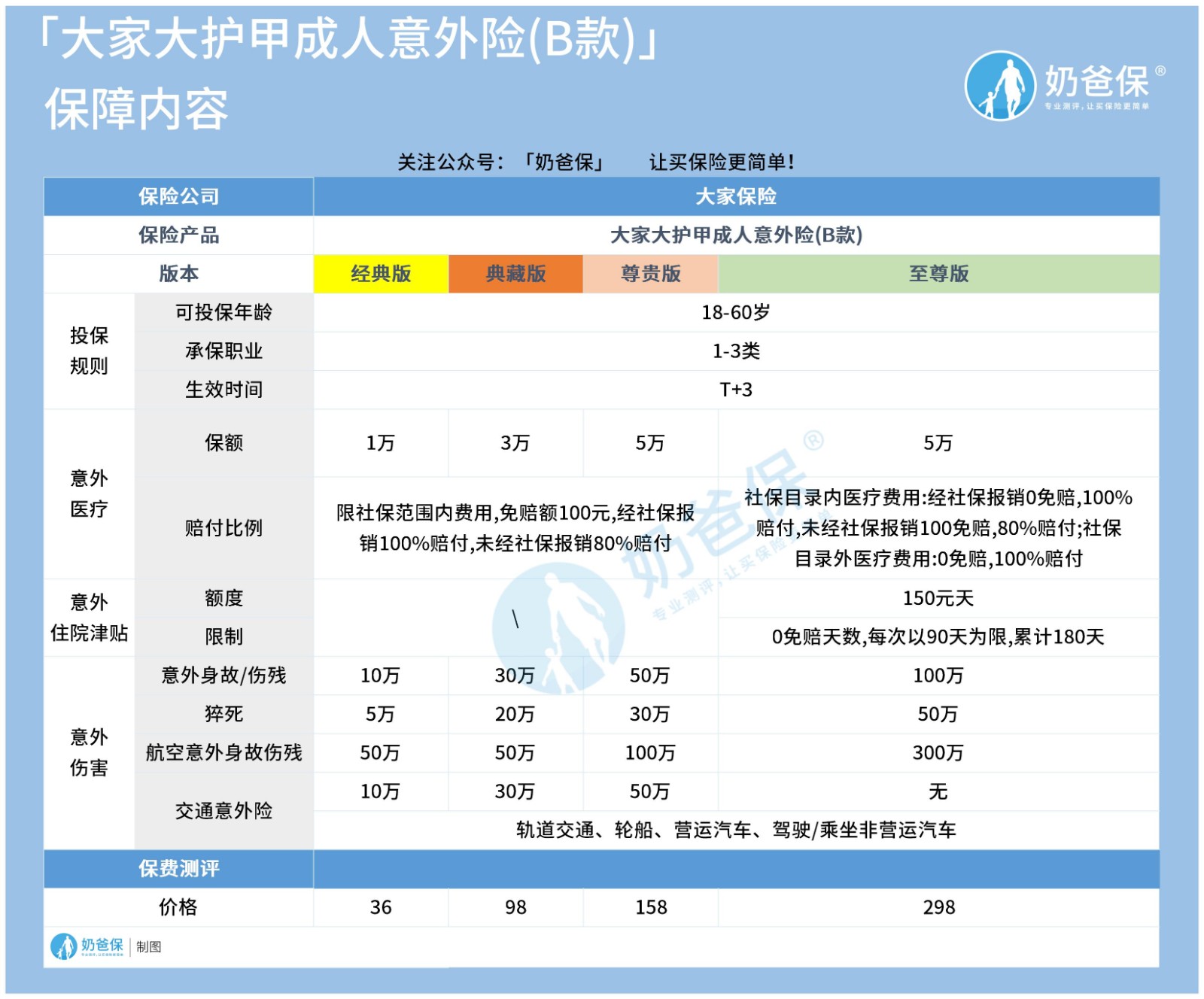 根据保费测算,这款产品不同版本,保费也不一样,经典版年交保费只需要36元,典藏版98元,尊贵版158元,至尊版298元。