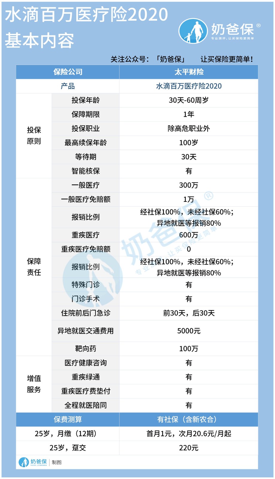 以上就是水滴保百万医疗险2020的保障内容,可以看到,这款产品的保额比较高,一般医疗保额、重疾医疗保额和靶向药保额,总保额高达1000万,保障力度是比较大的,能给被保人提供较强有力的疾病保障,且保障责任也比较丰富,增值服务也比较优质,是一款不错的百万医疗险产品。
