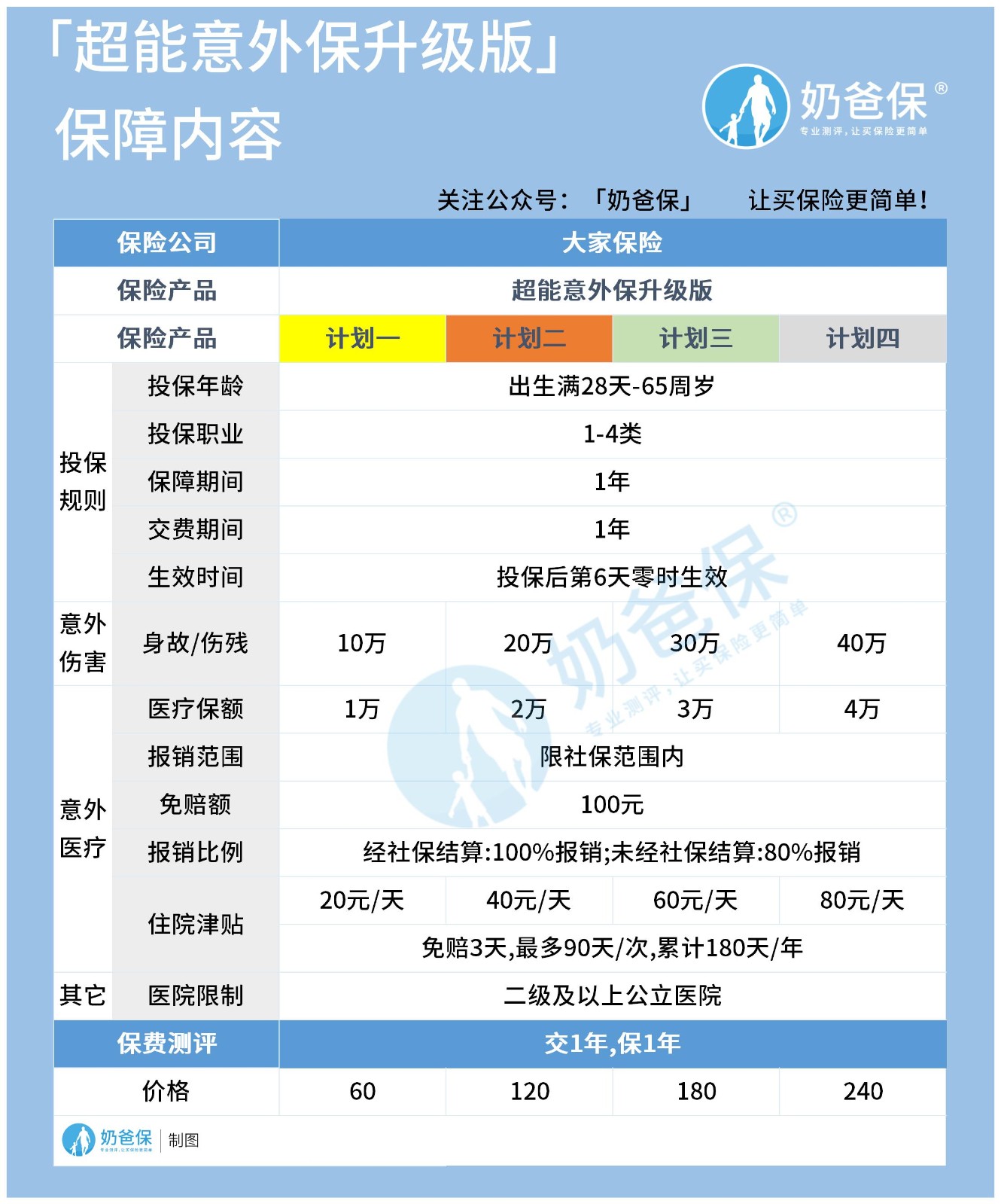 根据保费测算,超能意外保升级版计划一年交保费为60元,计划二是120元,计划三为180元,计划四240元。