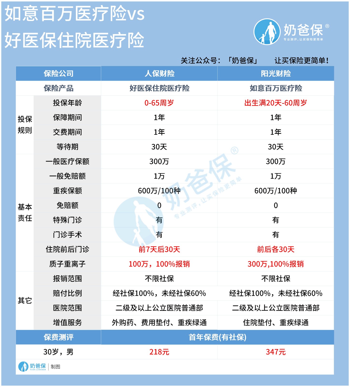 根据保费测算,30岁男性,在有社保的情况下,好医保住院医疗险的保费为218元,而如意百万医疗险的保费为347元,它们之间的保费相差了一百多,相比之下,好医保住院医疗险保费更便宜。