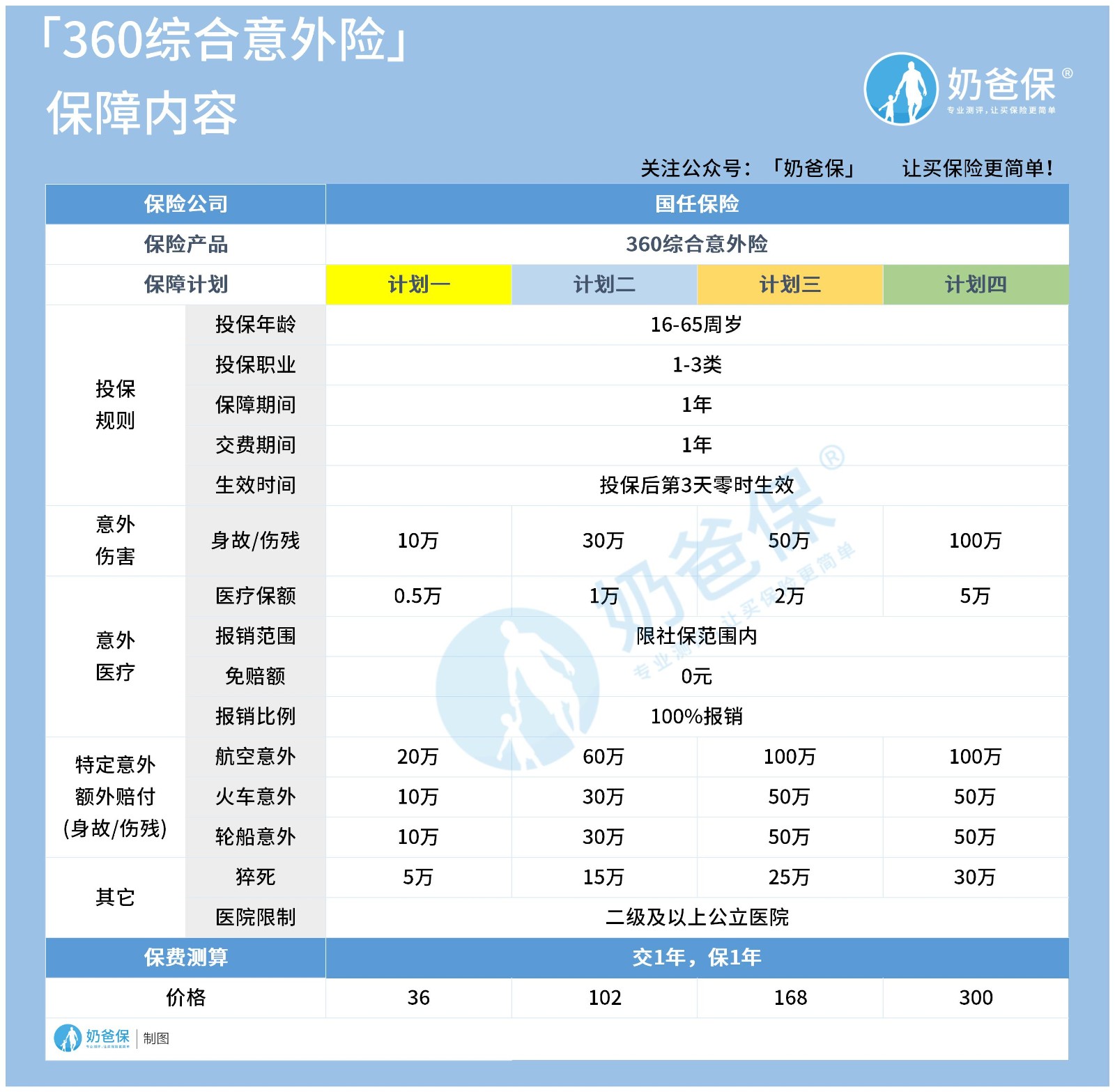 根据保费测算,国任保险360综合意外险计划一年交保费是36元,计划二是102元,计划三168元,计划四保费为300元/年。