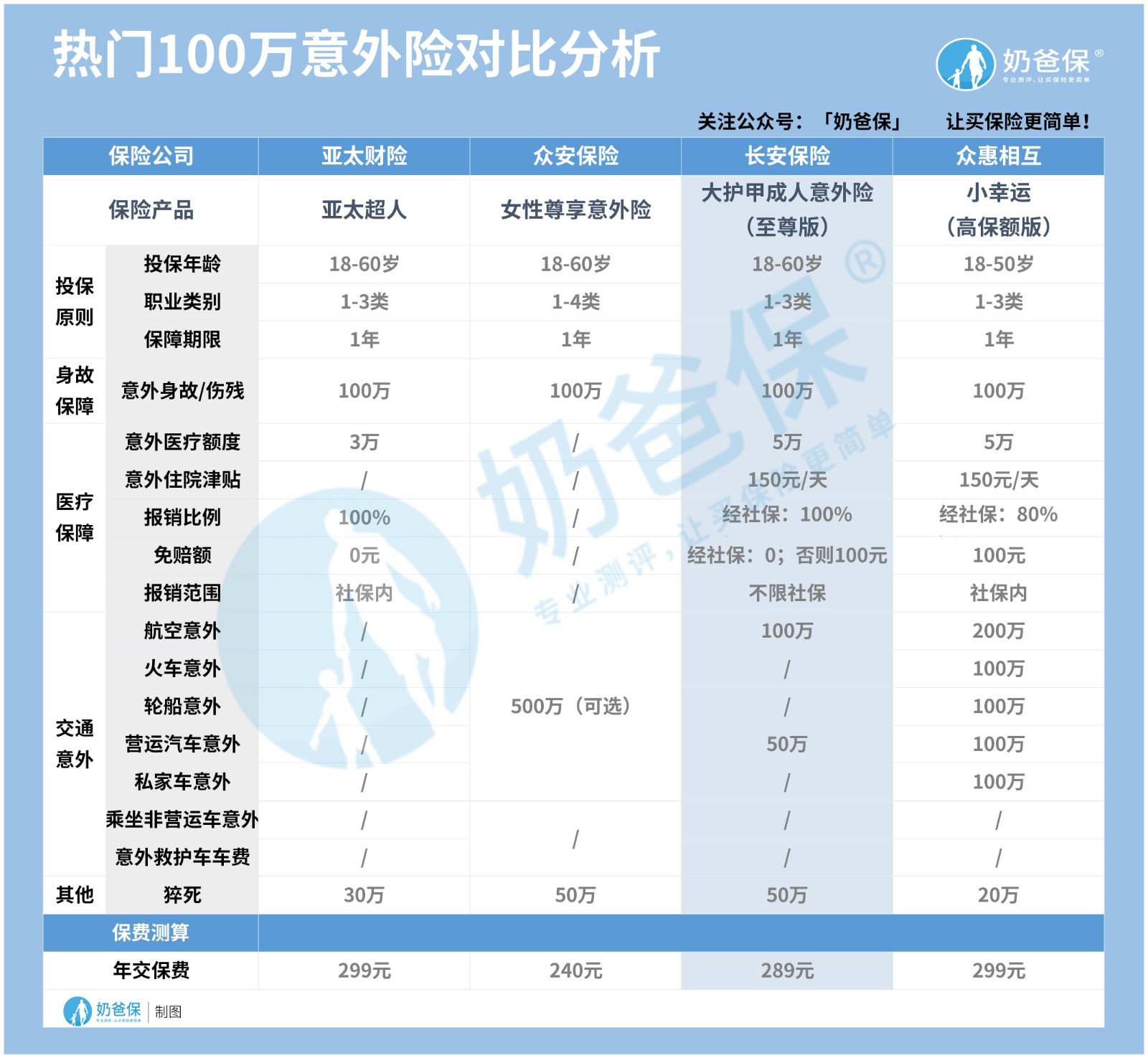 为了让大家知晓这款产品在同类意外险产品中的定位,奶爸还是照老规矩做了一张对比表,我们一起来看。