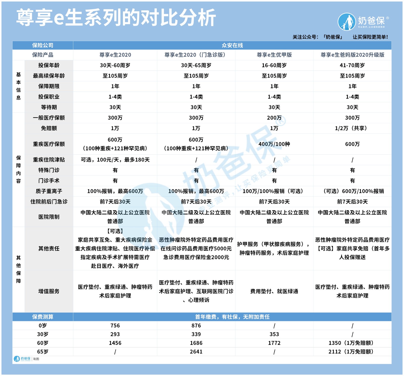 不过奶爸今天重点要介绍的不是保险公司,而是分析以尊享e生为名的四款产品:尊享e生2020、尊享e生2020(门急诊版)、尊享e生爸妈版2020以及尊享e生优甲版,给大家带来一个尊享e生百万医疗险系列测评。