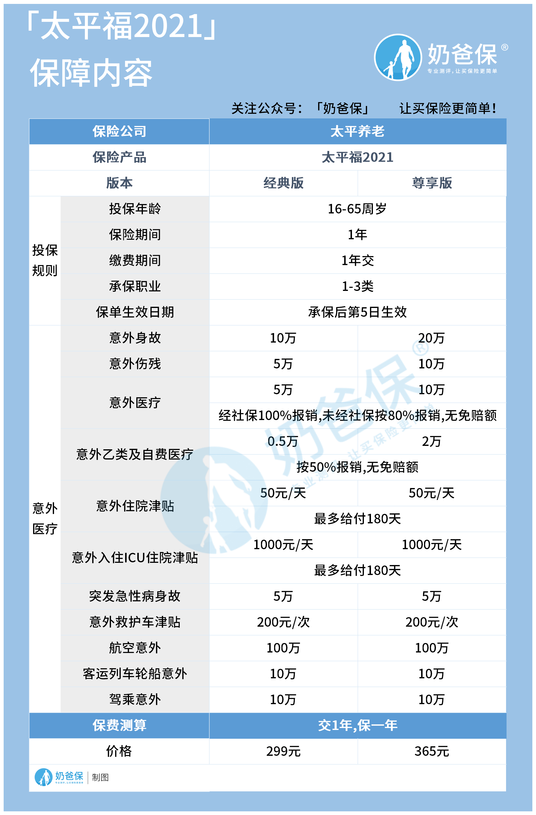 为了让大家能够更直观地了解太平福2021意外险,奶爸用一张表格整理出了它的基本保障内容,如下图所示: