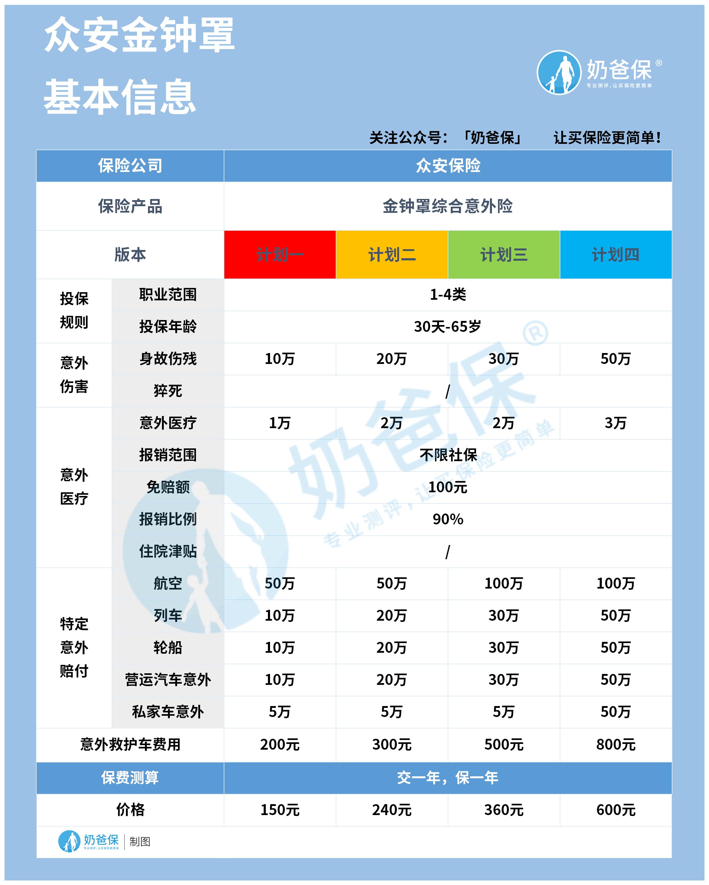 意外险的内容比较简单,奶爸把众安金钟罩的四个保障计划整理成一个表格,如下图: