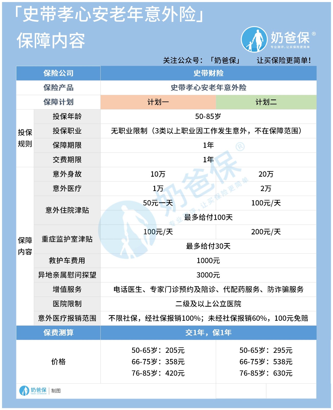 由上面的表格可以知道史带孝心安老年意外险两个保障计划最大的不同在于保额和保费,不过奶爸首先想说一下他们的共同点。