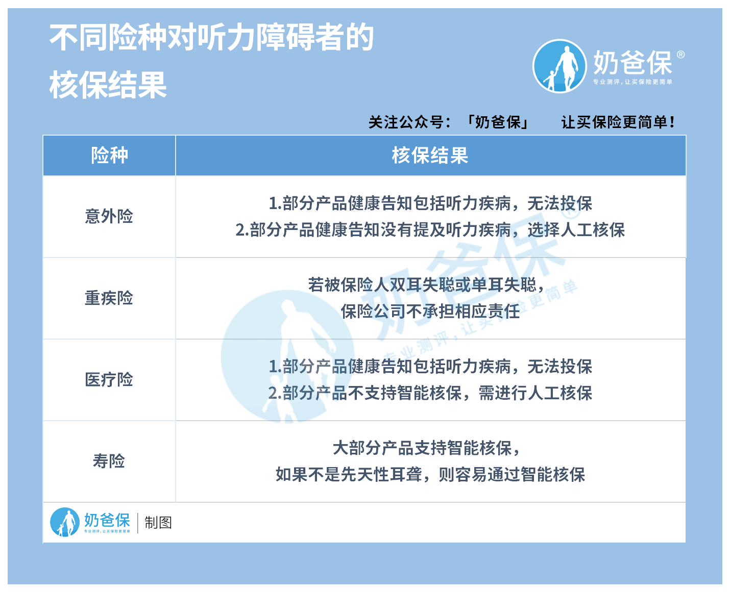 奶爸将不同险种对听力障碍者的核保结果也整理出来了: