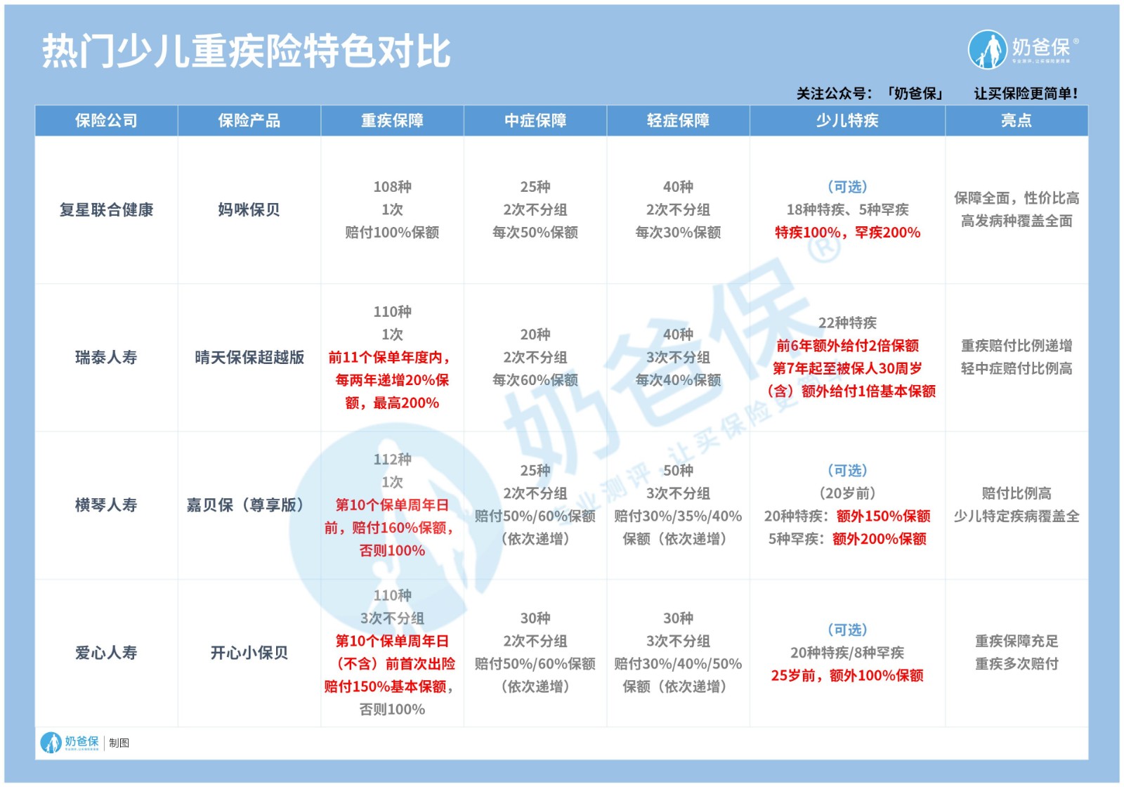 除了晴天保保超越版,目前高性价比的少儿重疾险,奶爸还挑了几款:爱心人寿开心小保贝、复星联合妈咪保贝、横琴嘉贝保。