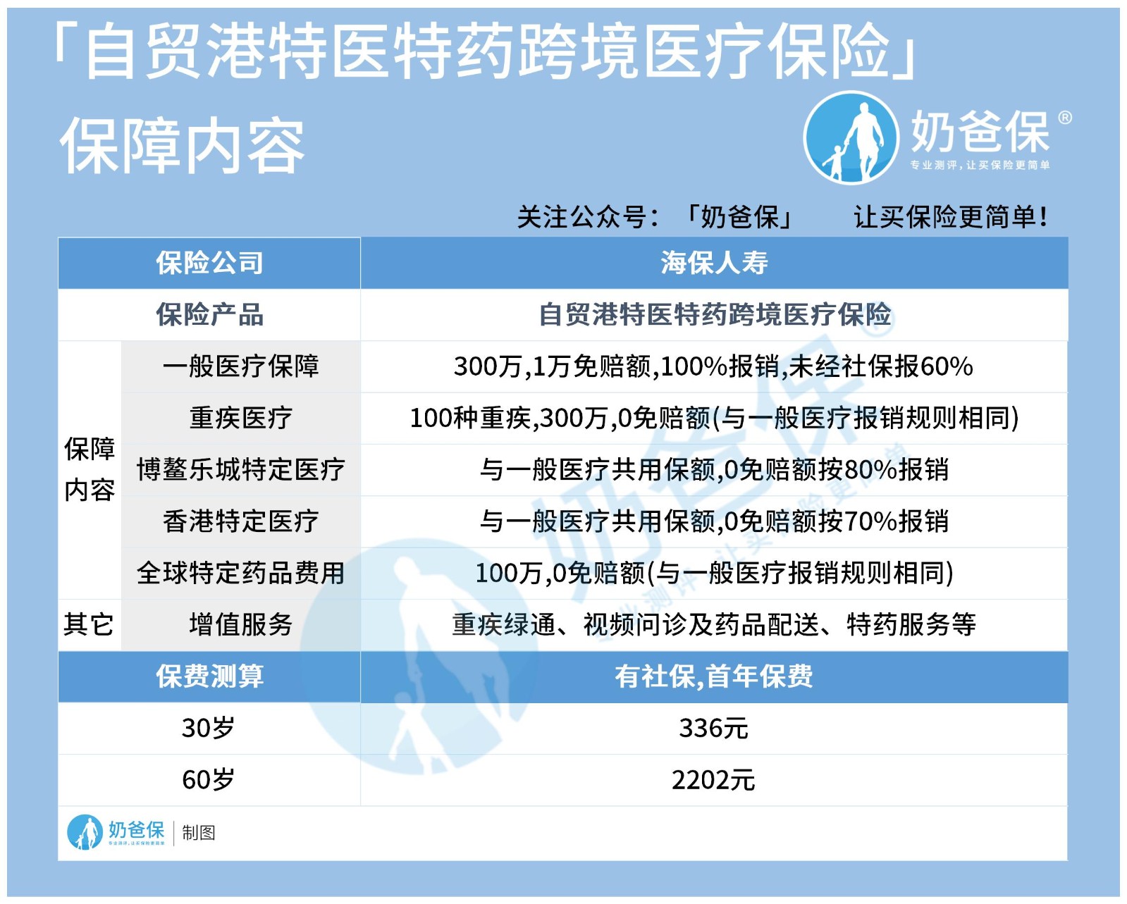 可能还有一些人对自贸港特医特药跨境医疗险的保障内容还不太了解,奶爸就简单介绍一下,以下是这款产品的内容表格: