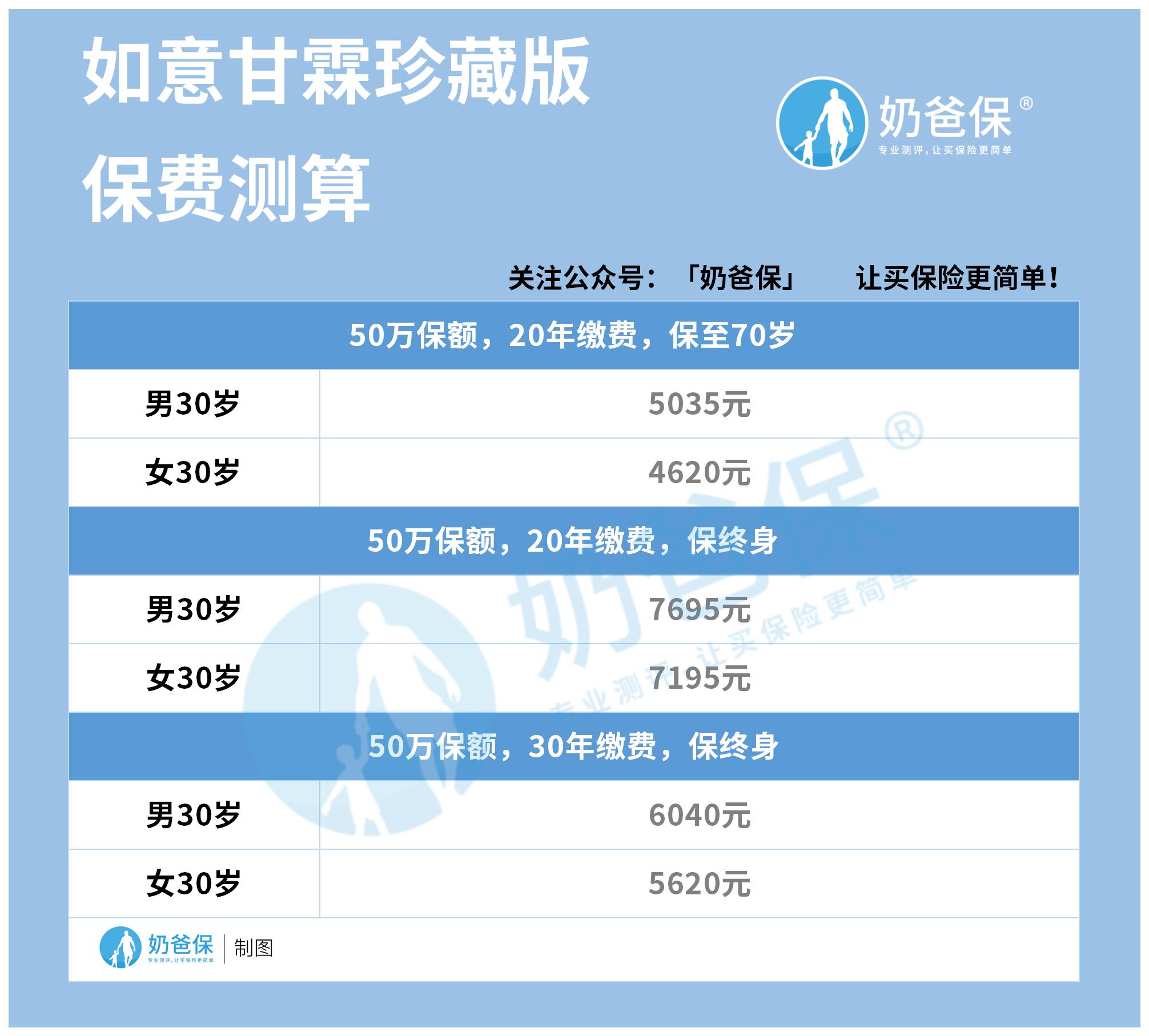 如果是选择保至70岁,50万保额,20年缴费的话,30岁男性每年的保费是5035元,30岁女性则是4620元,预算有限的人群可以选择保定期版本。