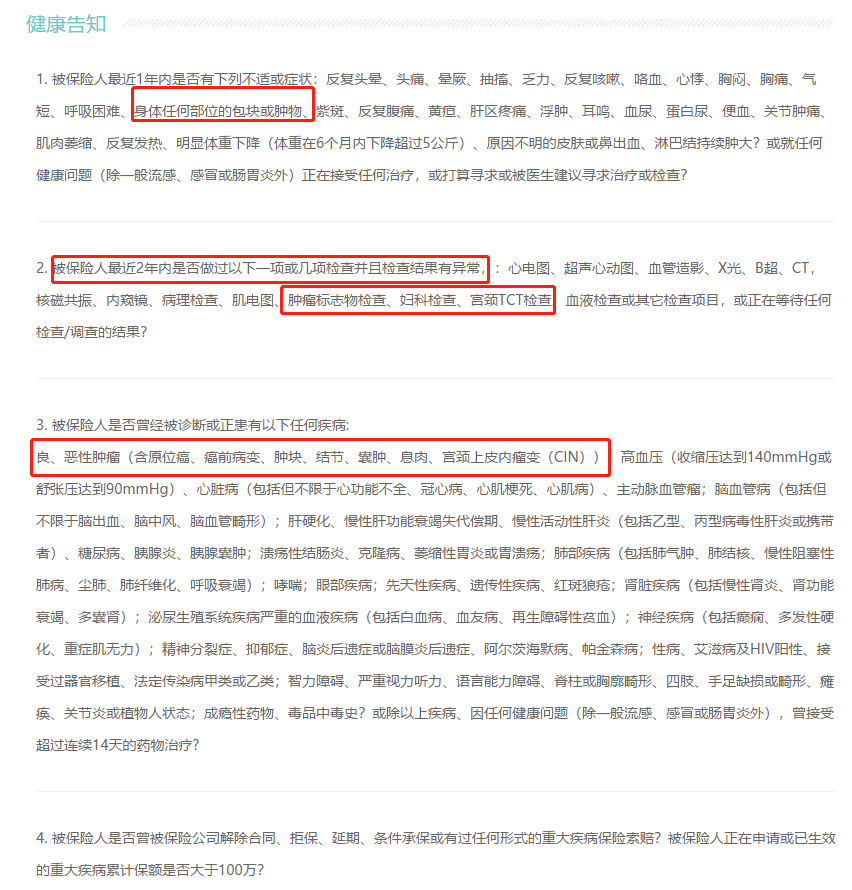 同时对良性和恶性肿瘤含原位癌,癌前病变,肿块,结节等都有问及,这些也是一般重疾险会问及的,不能算严格,只是正常询问。
