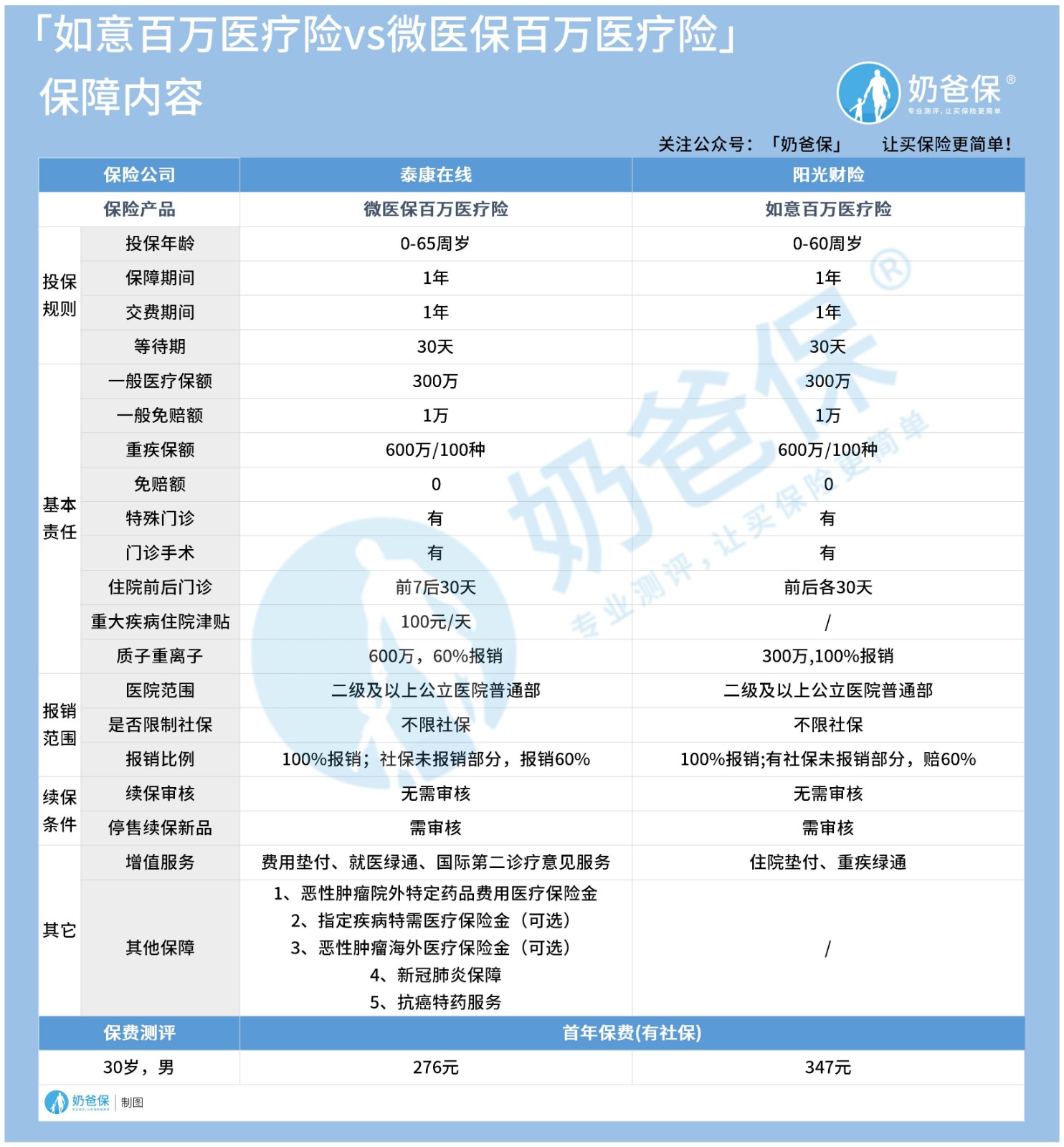 以30岁男性,有社保为例,微医保百万医疗险的保费为276元,如意百万医疗险的保费为347元,前者的保费更便宜。