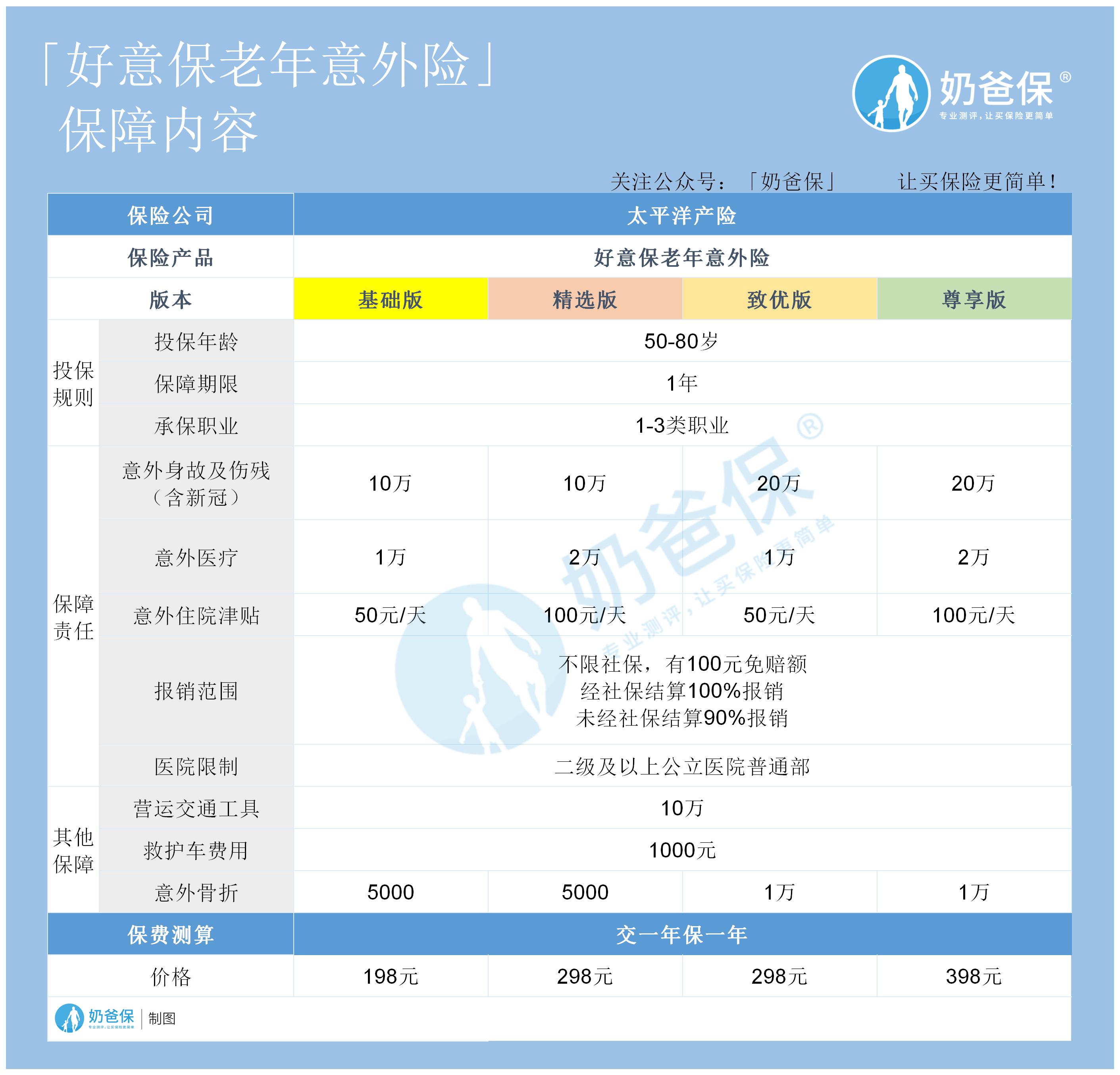 以上就是太平洋好意保老年意外险的全部内容了,特别注意的是这款产品适合高龄阶段的老年人 。如果年纪不大,身体各方面都很健康,可以咨询奶爸寻求保障内容更好的产品。