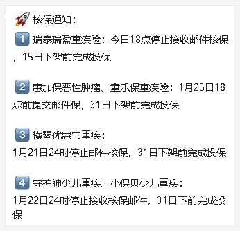 少儿重疾守护神、开心小保贝,1月31号停录,1月22号就会停止接收邮件核保。