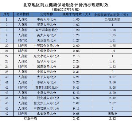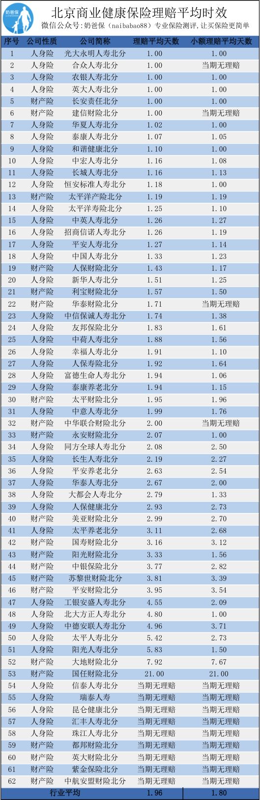 奶爸独家分析保险公司理赔数据 理赔平均速度逐渐变快 总体来说,北京保险公司的赔付速度都是非常快的,平均理赔时效是1.96天,而小额案件的理赔速度会更快一点,平均时间是1.8天。 奶爸稍微整理了一下大半年前的数据,下表分别列出排名在前、中、后的保险公司理赔天数。一天内神速理赔的保险公司越来越多,而中后段位排名的公司,理赔速度也越来越快,理赔时间多于5天的保险公司也越来越少了。 理赔速度跟保险公司规模没有联系 平均理赔时间只需要1天的公司有:光大永明人寿、合众人寿、农银人寿、英大人寿、长安责任、建信财险。不过相信我们大部分人对他们都不太熟悉。 而大多数人熟悉的大公司,比如中国人寿、平安人寿等,理赔速度只能说是中上水平。 无论是数据统计结果还是奶爸的感官认识,理赔的速度跟保险公司的规模还真的关系不大。 小规模保险公司 理赔速度提升快 留意大半年前的理赔速度第一梯队,大部分是大家比较熟悉的大保险公司:华夏、太平洋、美亚等。 不过今年的形势不一样了,这些大规模公司排名往后掉。不过并不是他们理赔变慢了,而是市场上多了很多“后起之秀”。 越来越多小规模保险公司,在理赔方面作出很大的努力。比如: “直付结算,省心便捷”、“微信操作,轻松理赔”、“突发事件,绿色通道”、“减免索赔资料”等缩减理赔流程的新制度等等。 *奶爸提醒:以上理赔时效的统计只是北京数据,不能代表全国情况,仅做参考。