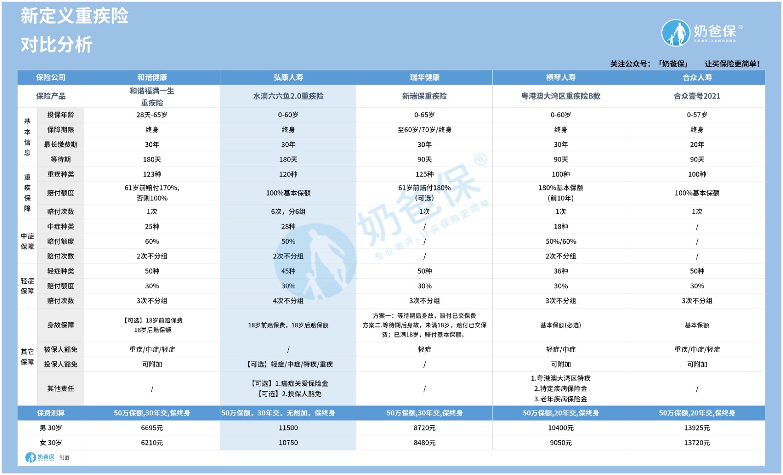为了让大多数消费者能对新定义重疾险有一个比较全面的了解,奶爸特意搜集几款已经上线和即将上线的新定义重疾险产品的资料,并做了一张对比表,我们一起来看: