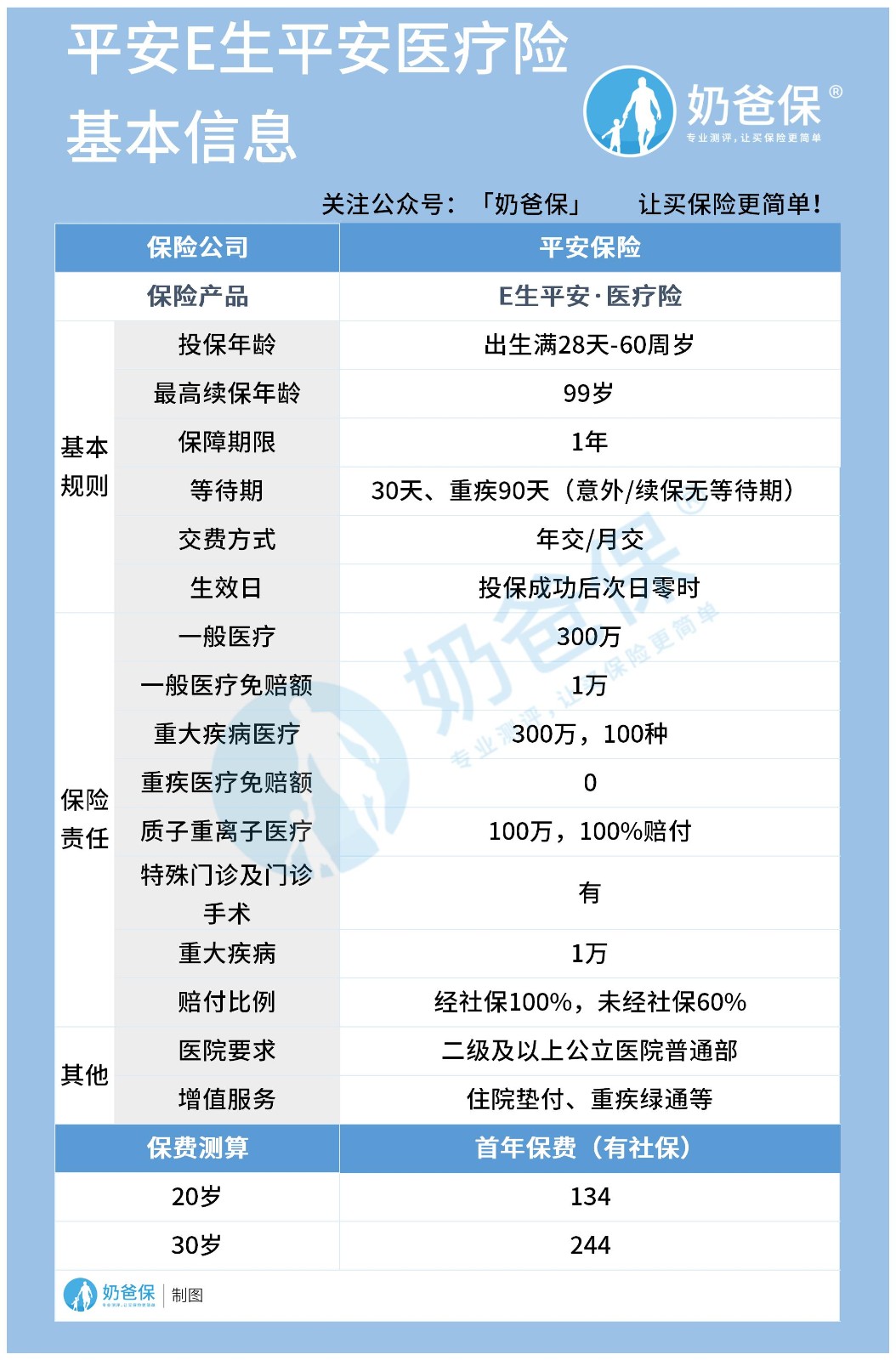 这款产品是平安财险承保的,是1年期的百万医疗险产品,不保证续保,奶爸对它的基本保障也做了初步了解,发现这款产品中规中矩,并没有很大的亮点。