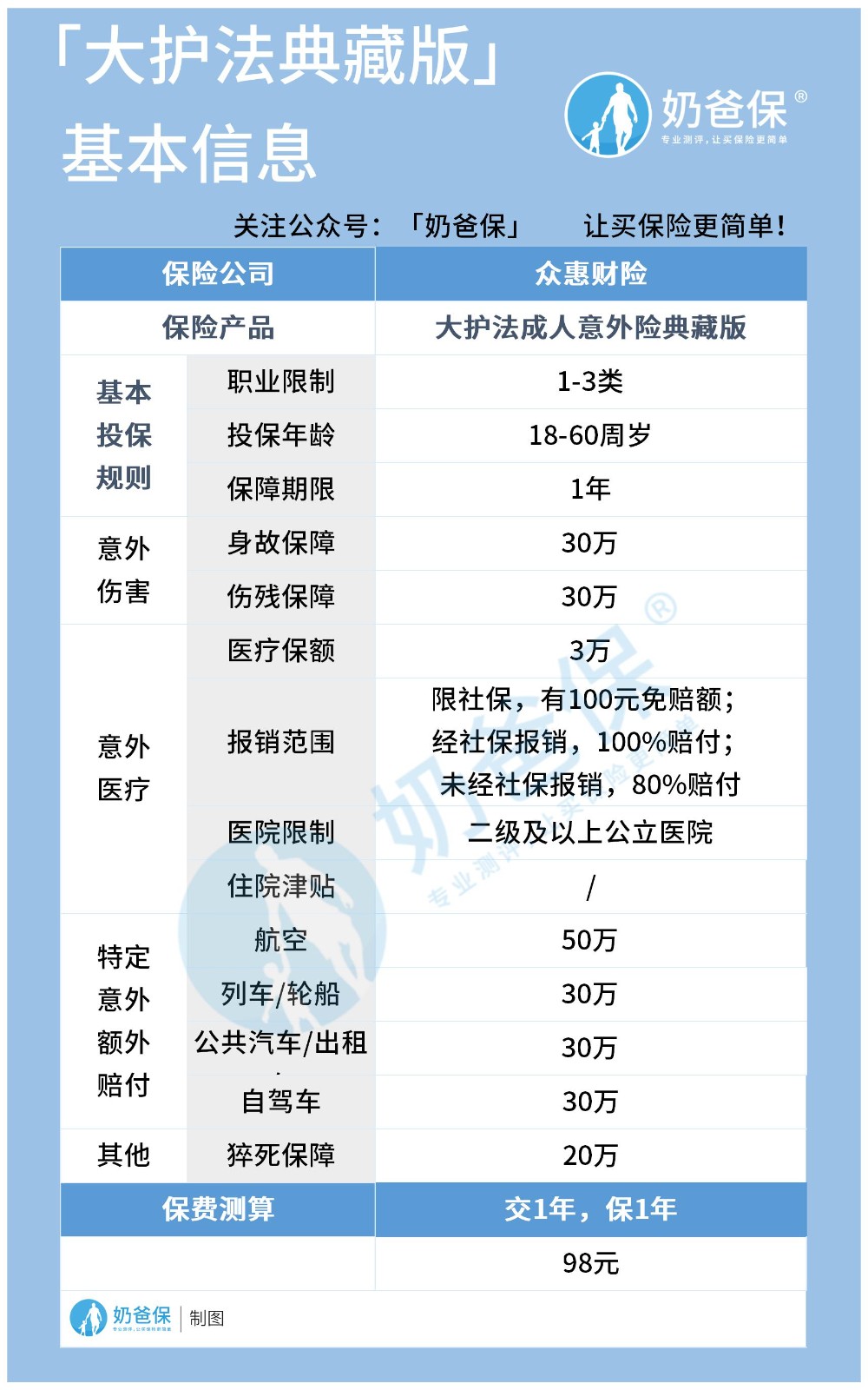 可以看到,大护法成人意外险典藏版是短期成人意外险,交一年保一年,年保费只需要98元,差不多100元。