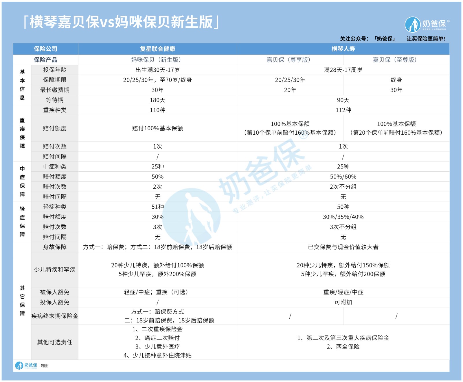 以上是妈咪保贝新生版和横琴嘉贝保的对比,奶爸接下来分析妈咪保贝新生版的优缺点。