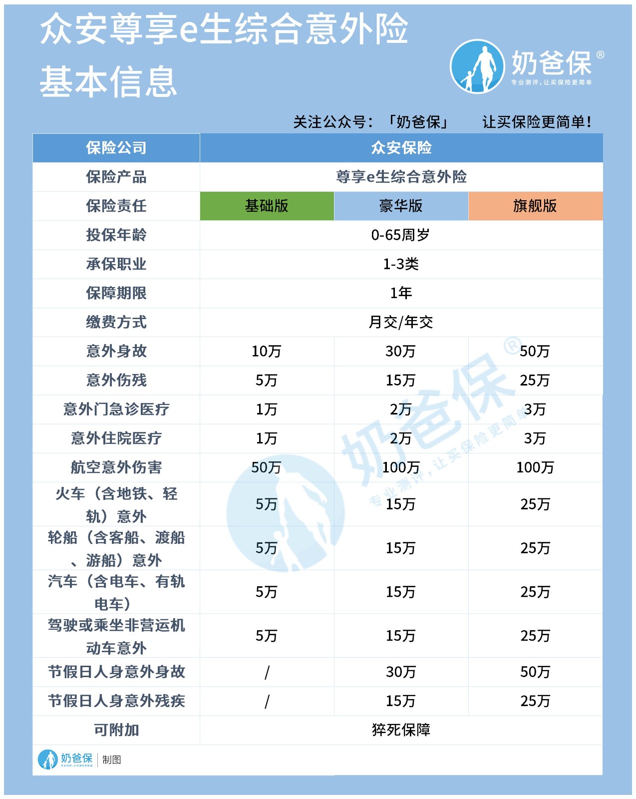 因为众安尊享e生综合意外险版本比较多,奶爸将不同版本放在一张表格中。