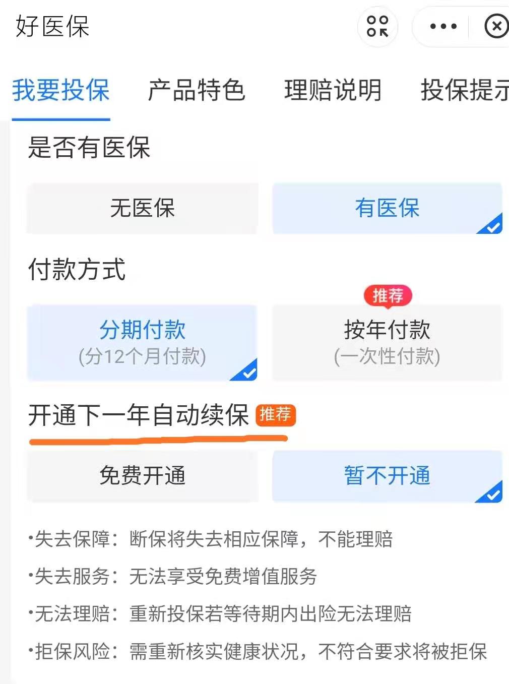 可以看到好医保住院医疗在投保页面出现“自动续保”,有误导消费者的嫌疑。