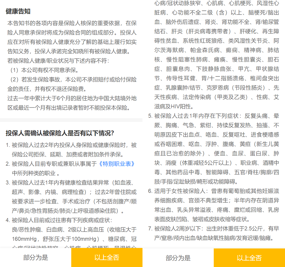 此外,对于婴幼儿和女性被保人还有额外的健康告知条款,0免赔版本的健康告知也会有所差异。