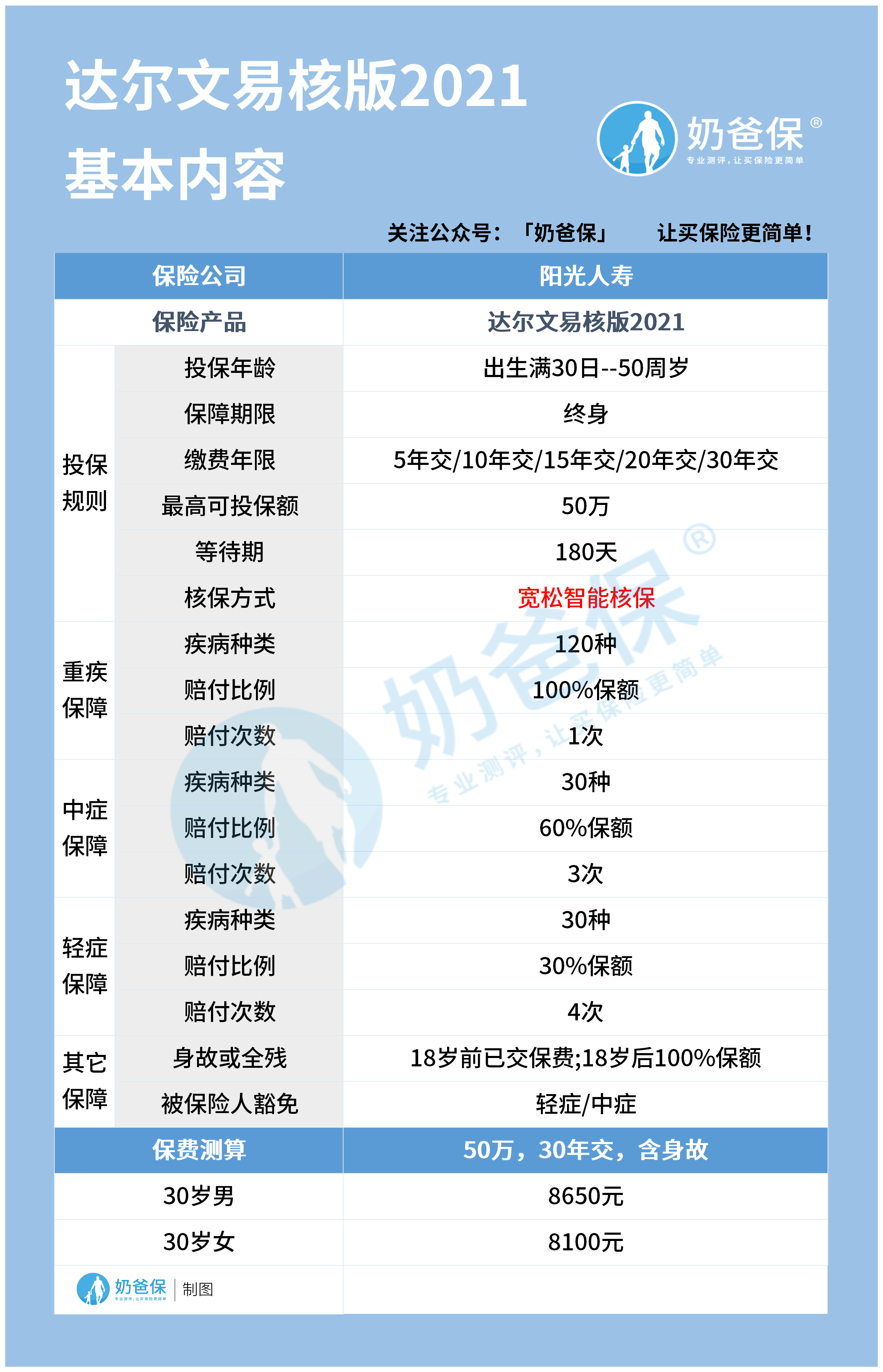 为了让大家直观了解达尔文易核版2021重疾险的保障内容,奶爸特意做了一张基本信息表,下面我们一起来看: