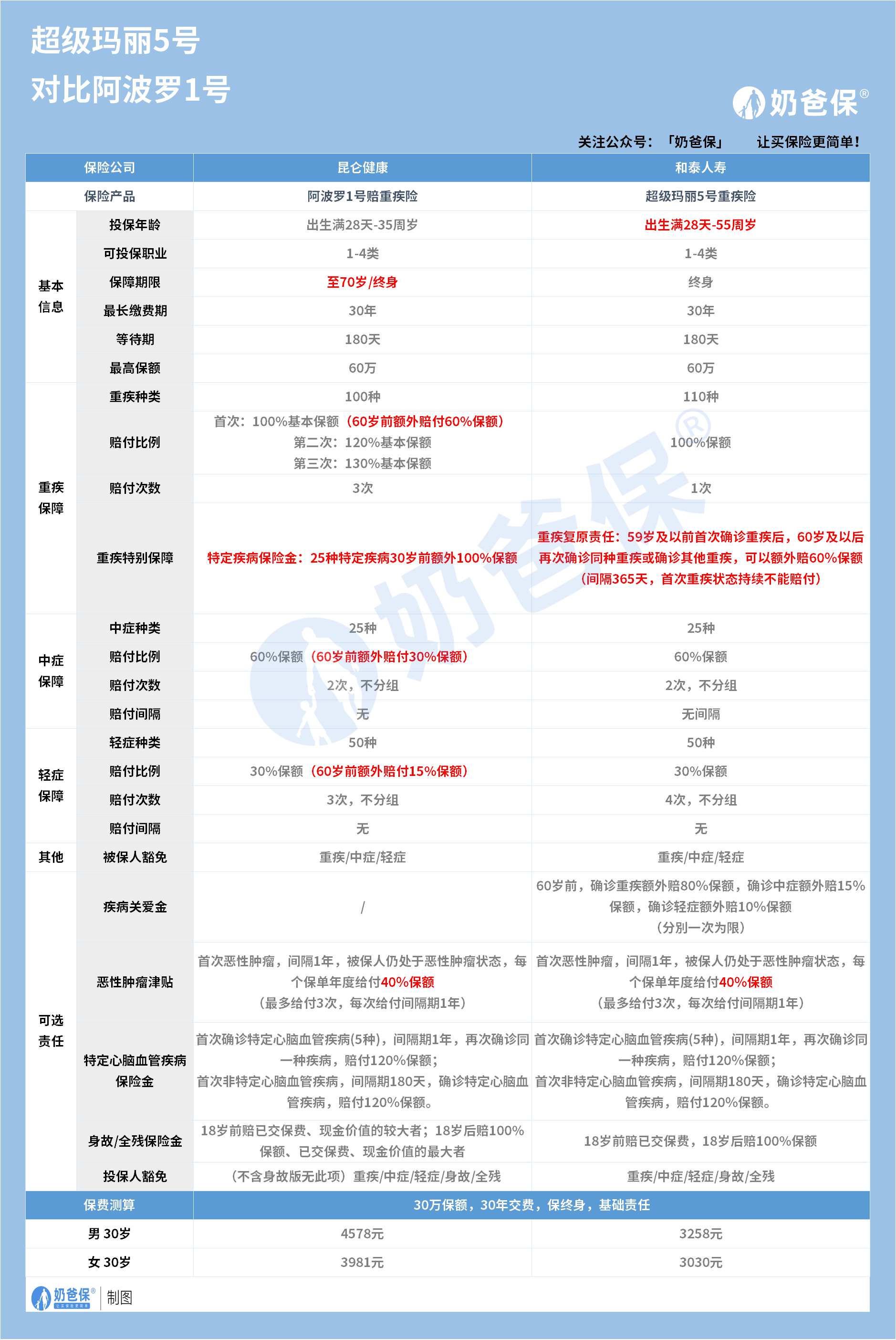 01昆仑健康阿波罗1号重疾险和超级玛丽5号哪个好?