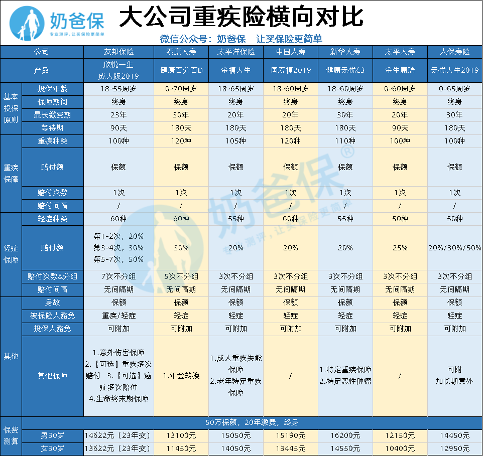 奶爸拿了同类大公司重疾险与无忧人生2019重大疾病保险作为对比,看看无忧人生2019竞争力如何: