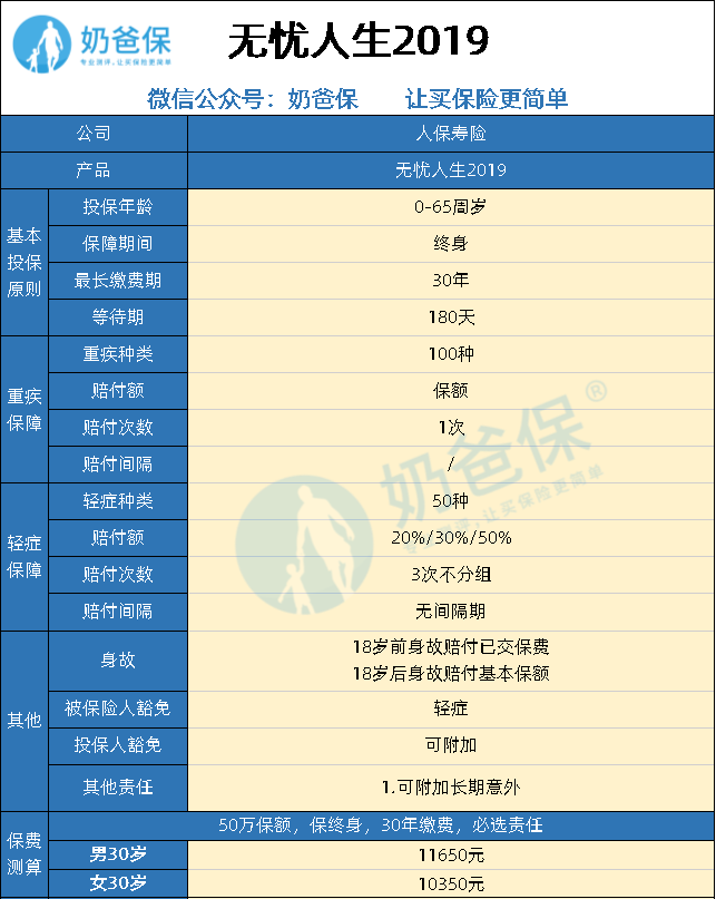在介绍无忧人生2019重疾险之前,奶爸先给大家介绍一下无忧人生2019的基本产品结构:重疾单次赔付+轻症不分组多次赔付+身故责任+豁免条款+可附加长期意外险。话不多说,奶爸给大家上无忧人生2019的具体内容表格:
