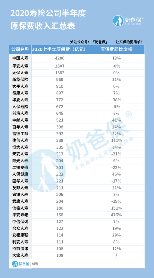 按照这份表格我们可以得知,根据2020年上半年各大寿险公司的原保费收入排名,中国保险公司排行榜前十是哪些?如下所示:
